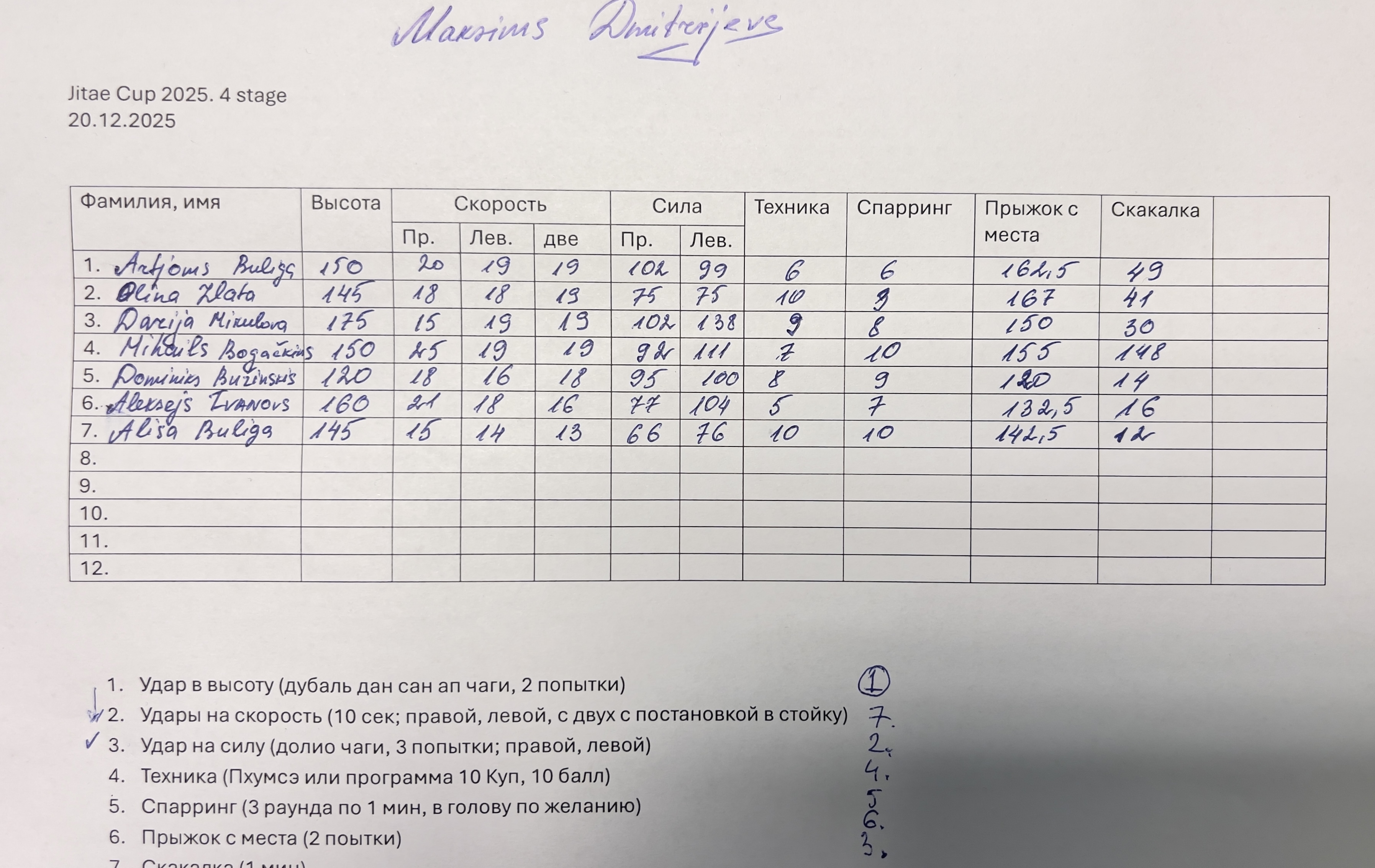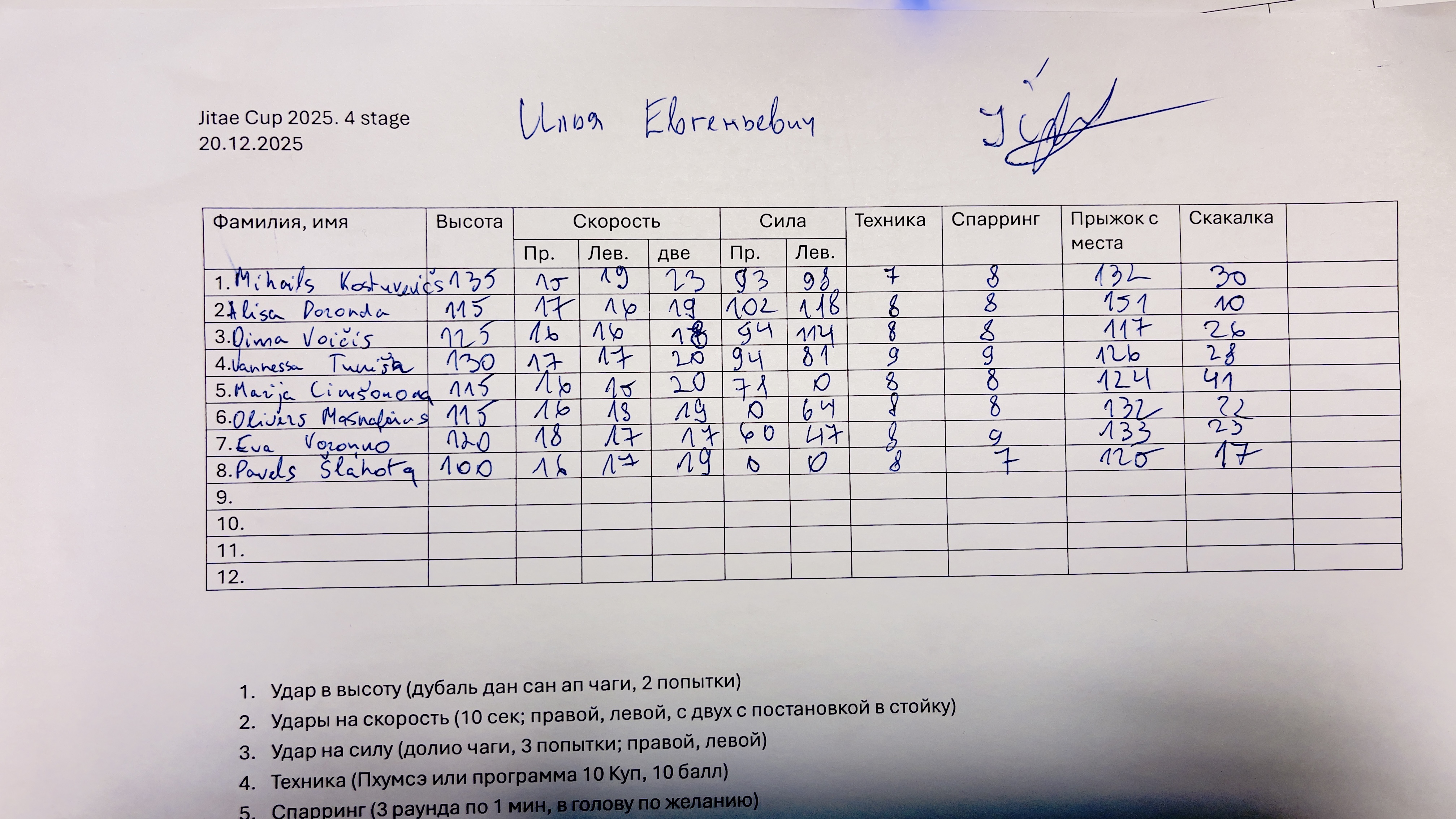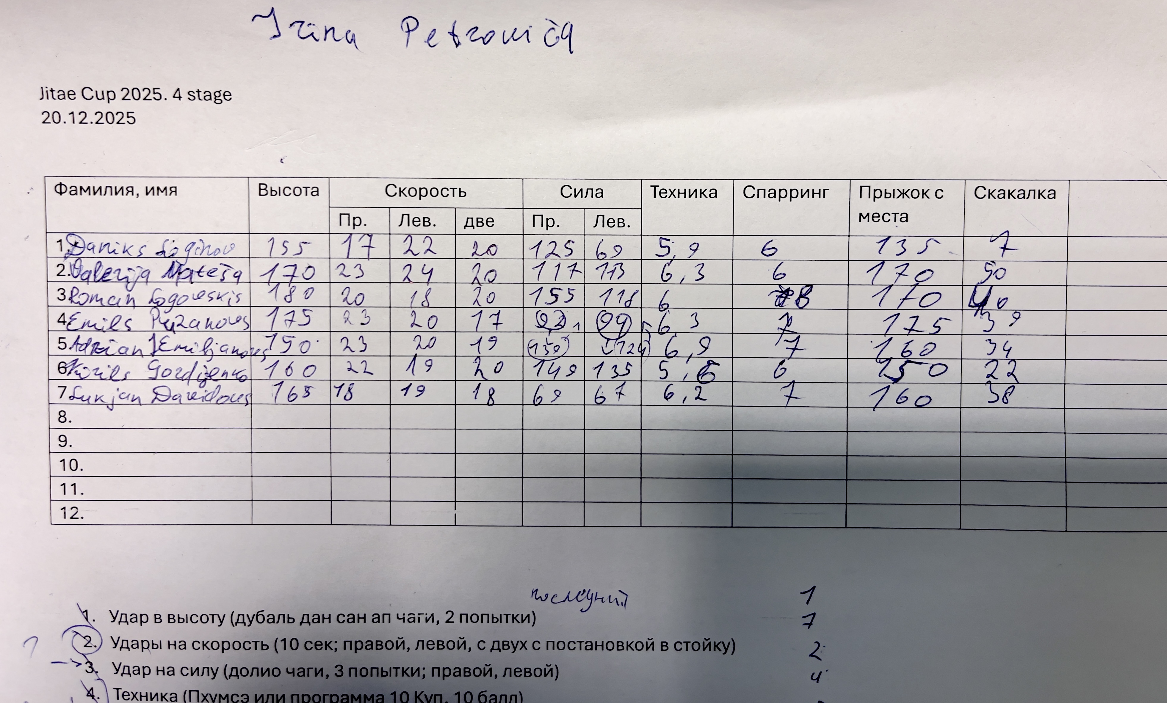 • Sitieni uz spēku (dolio čagi) — 3 mēģinājumi ar katru kāju, ieskaitē labākais.