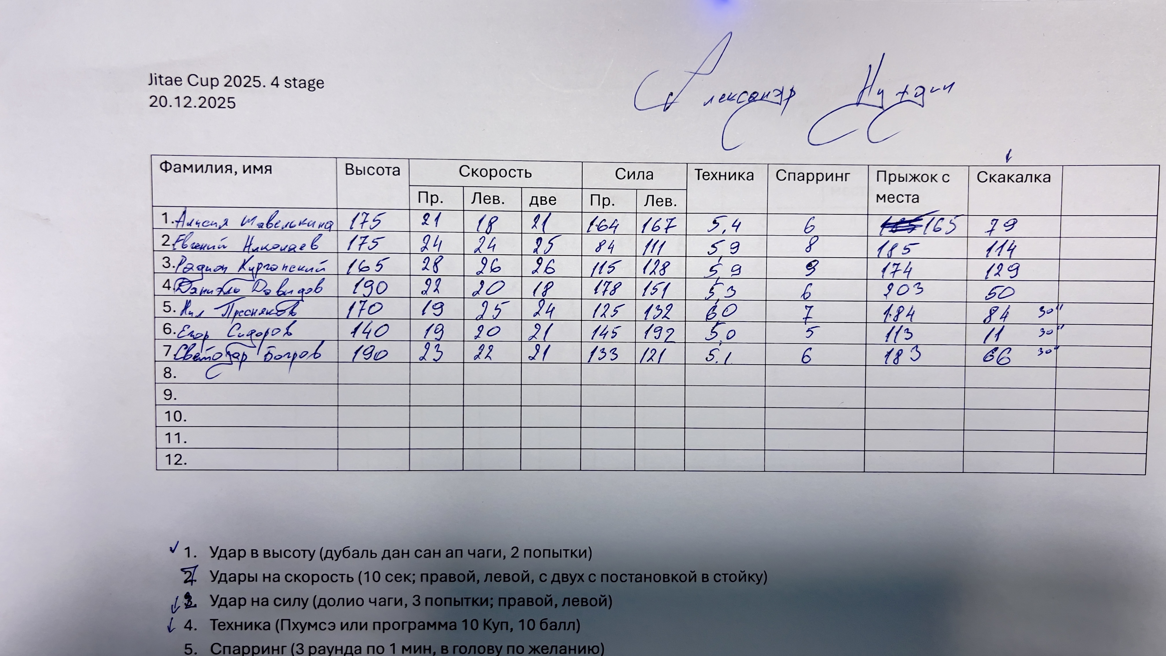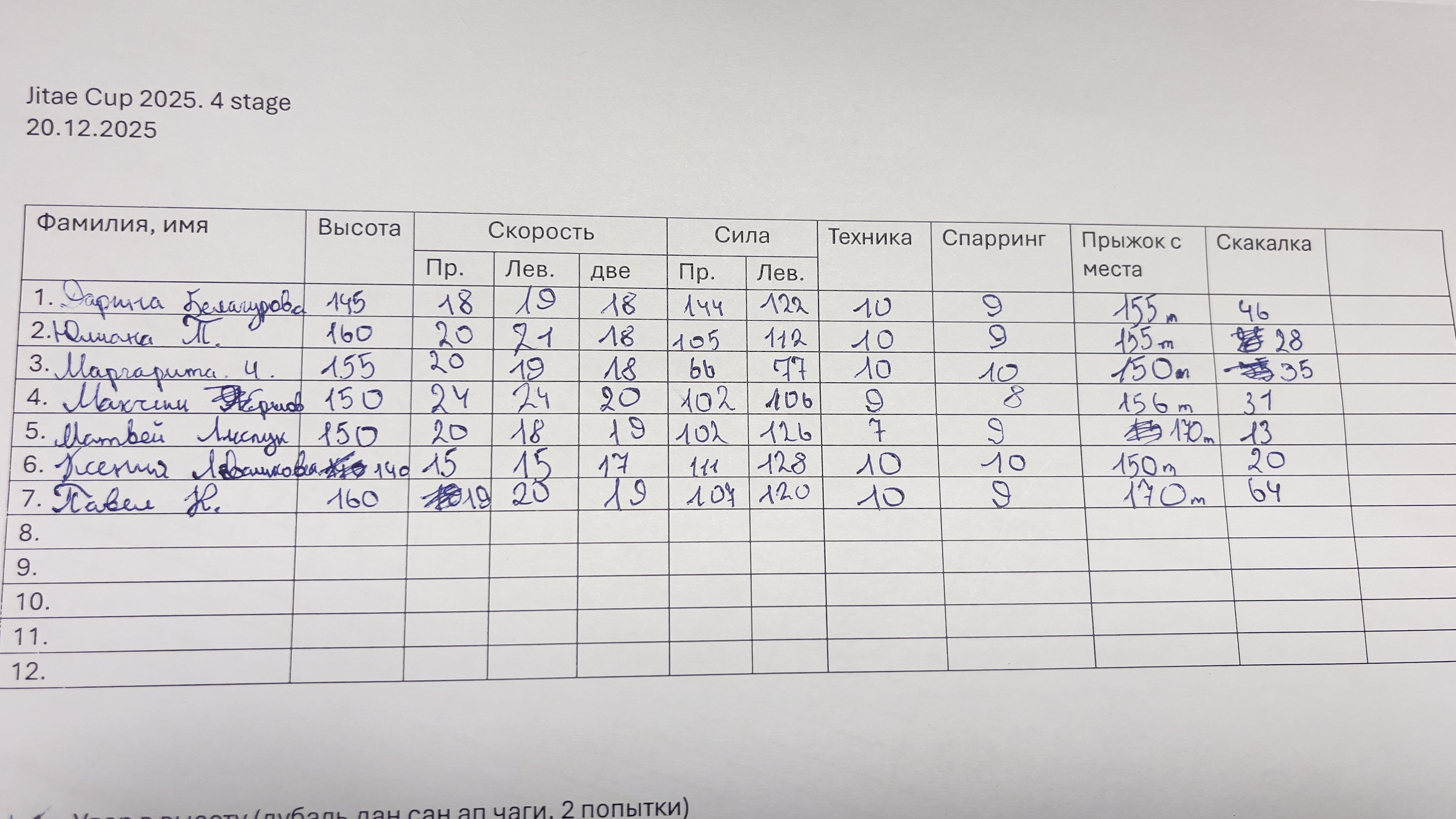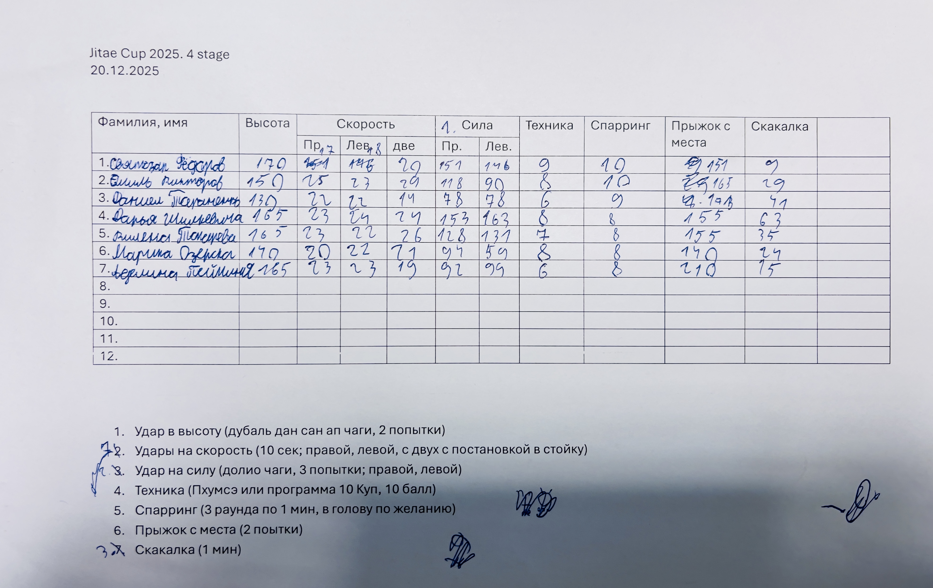 • Sitieni uz spēku (dolio čagi) — 3 mēģinājumi ar katru kāju, ieskaitē labākais.